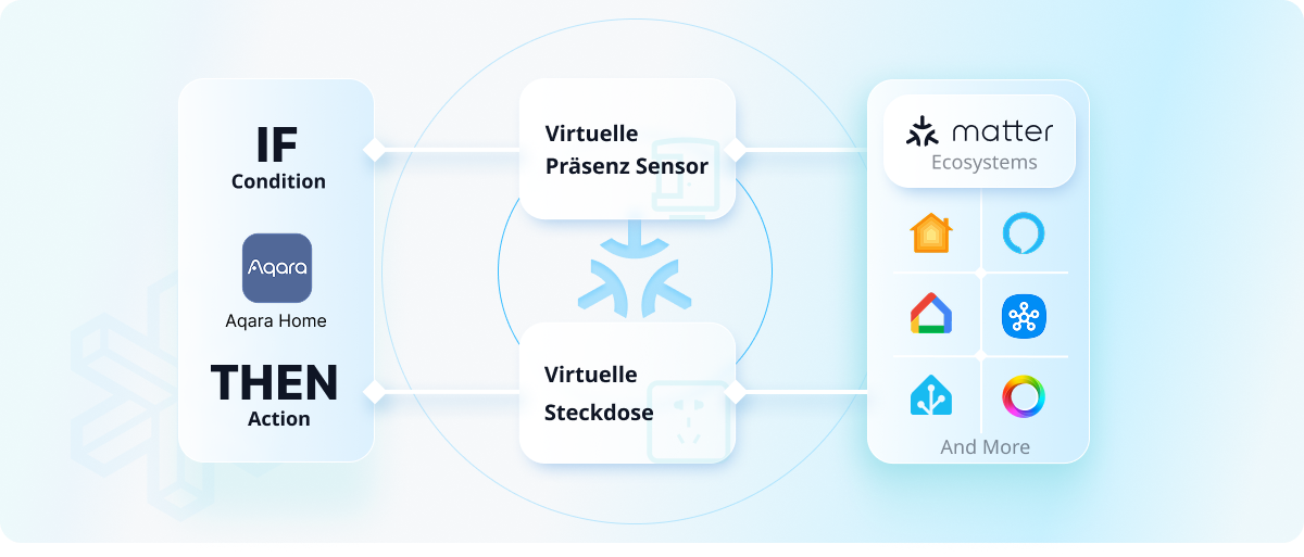 Um erweiterte Matter Bridging nutzen zu können, benötigen Sie einen Aqara-Hub mit Matter-Bridge-Funktion, der in Ihr gewünschtes Matter-Ökosystem verbunden ist (z. B. Apple Home, Google Home, Amazon Alexa, Samsung SmartThings, Home Assistant, Homey u. a.)