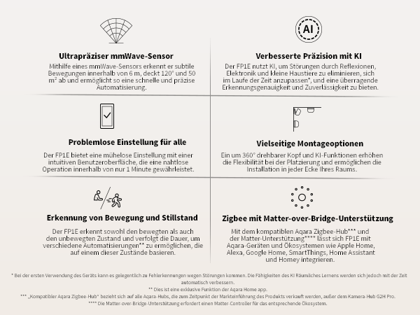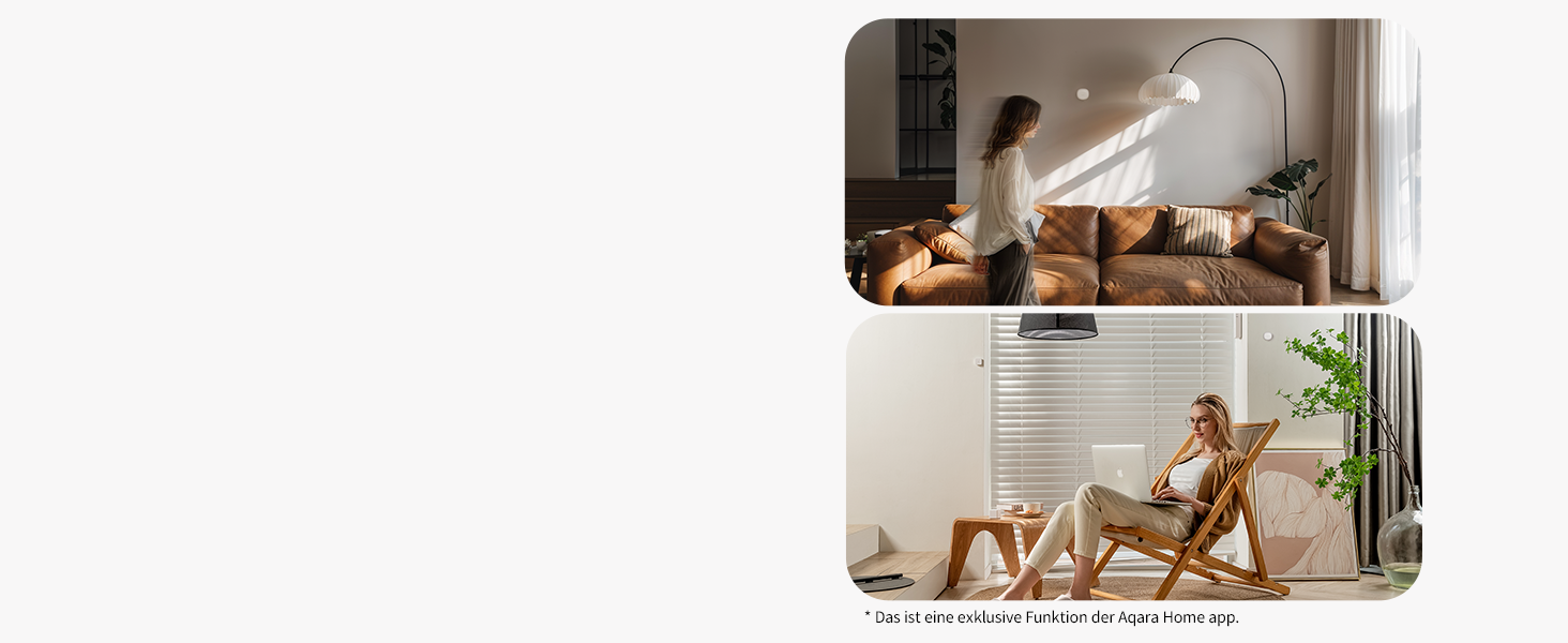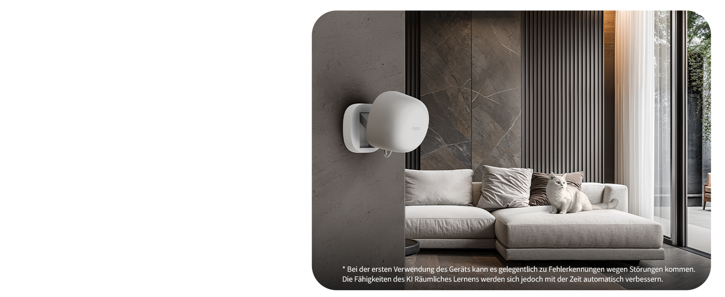 Mit der TriD-Space AI von Aqara Lab eliminiert der FP1E Störungen durch Glas, Spiegel und herkömmliche Elektrogeräte ebenso wie durch Haustiere. Außerdem passt es die Erkennungsempfindlichkeit an, um Fehlalarme zu vermeiden.*