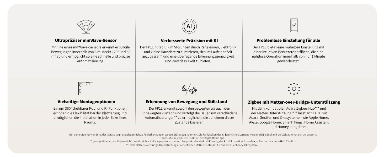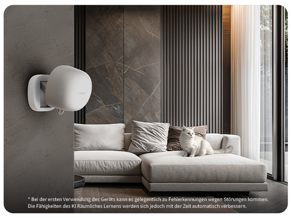 Mit der TriD-Space AI von Aqara Lab eliminiert der FP1E Störungen durch Glas, Spiegel und herkömmliche Elektrogeräte ebenso wie durch Haustiere. Außerdem passt es die Erkennungsempfindlichkeit an, um Fehlalarme zu vermeiden.
