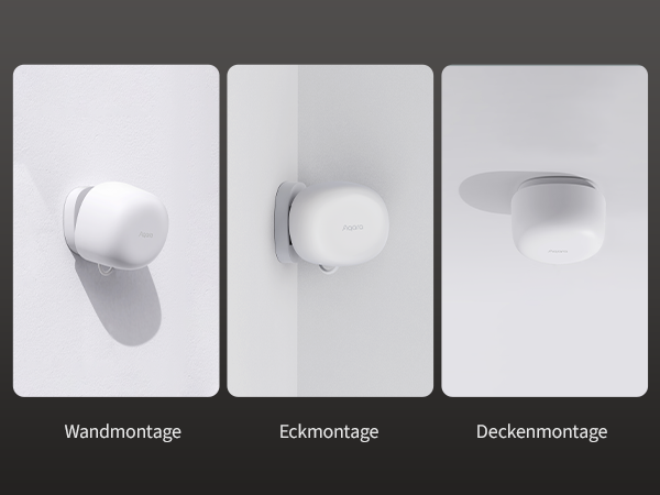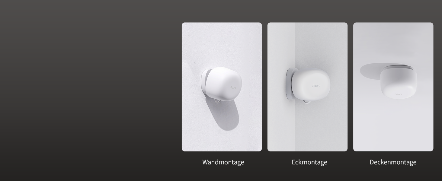 Der Präsenzsensor FP1E lässt sich leicht an Wänden, Decken oder in Ecken installieren. Sein um 360° drehbarer Sensorkopf nutzt AI, um Interferenzen zu minimieren und eine flexible Platzierung zu gewährleisten.