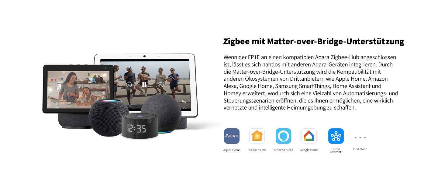 Wenn der FPlE an einen kompatiblen Agara Zigbee-Hub angeschlossen ist, lässt es sich nahtlos mit anderen Agara-Geräten integrieren. Durch die Matter-over-Bridge-Unterstützung wird die Kompatibilität mit anderen Ökosystemen von Drittanbietern.