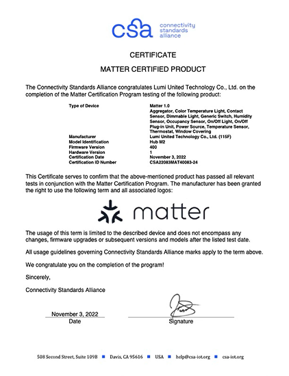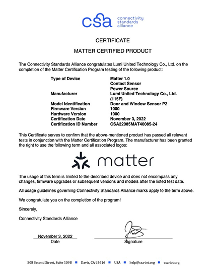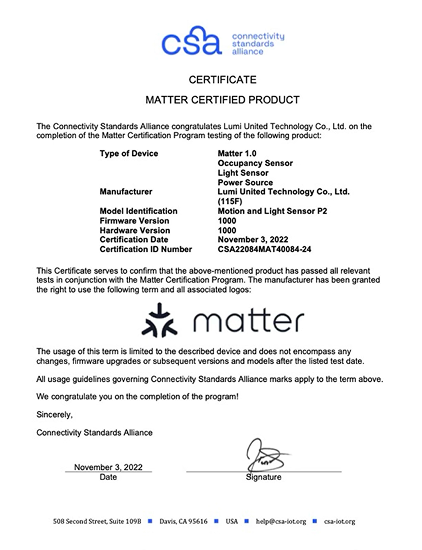 – All Aqara Matter products have been functionally and security tested by CSA-authorized laboratories (e.g., UL Solutions, TÜV Rheinland), and are officially Matter-certified.