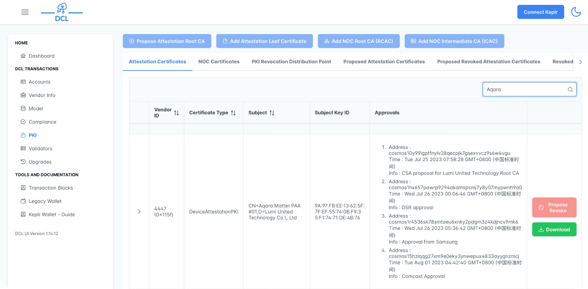 Additionally, Aqara has deployed a Distributed Compliance Ledger (DCL) server to securely store and synchronize certification declarations (CDs) and certificate chain data for both Aqara and third-party vendors. This infrastructure enables robust compliance verification and traceable device identity within the Matter ecosystem.