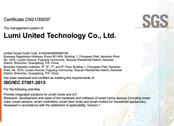 Aqara’s cloud services have obtained multiple global security and compliance certifications, including: