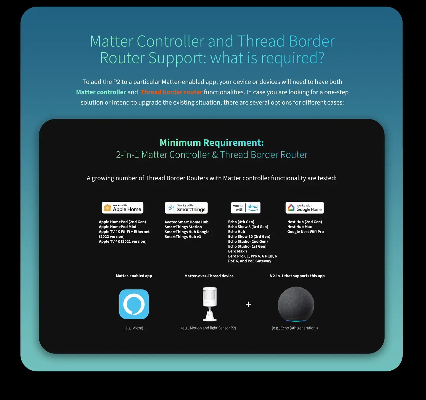スマートホーム統⼀規格MatterにThread経由で対応しているので、ユーザーは異なるエコシステムと通信⽅式間の互換性を⼼配する必要性がなく、最⼩限でMatterアプリ、ThreadボダールーターとMatterコントローラーの2 in 1Matterハブさえあれば、どのエコシステムでも⼈感センサー P2を利⽤できます。