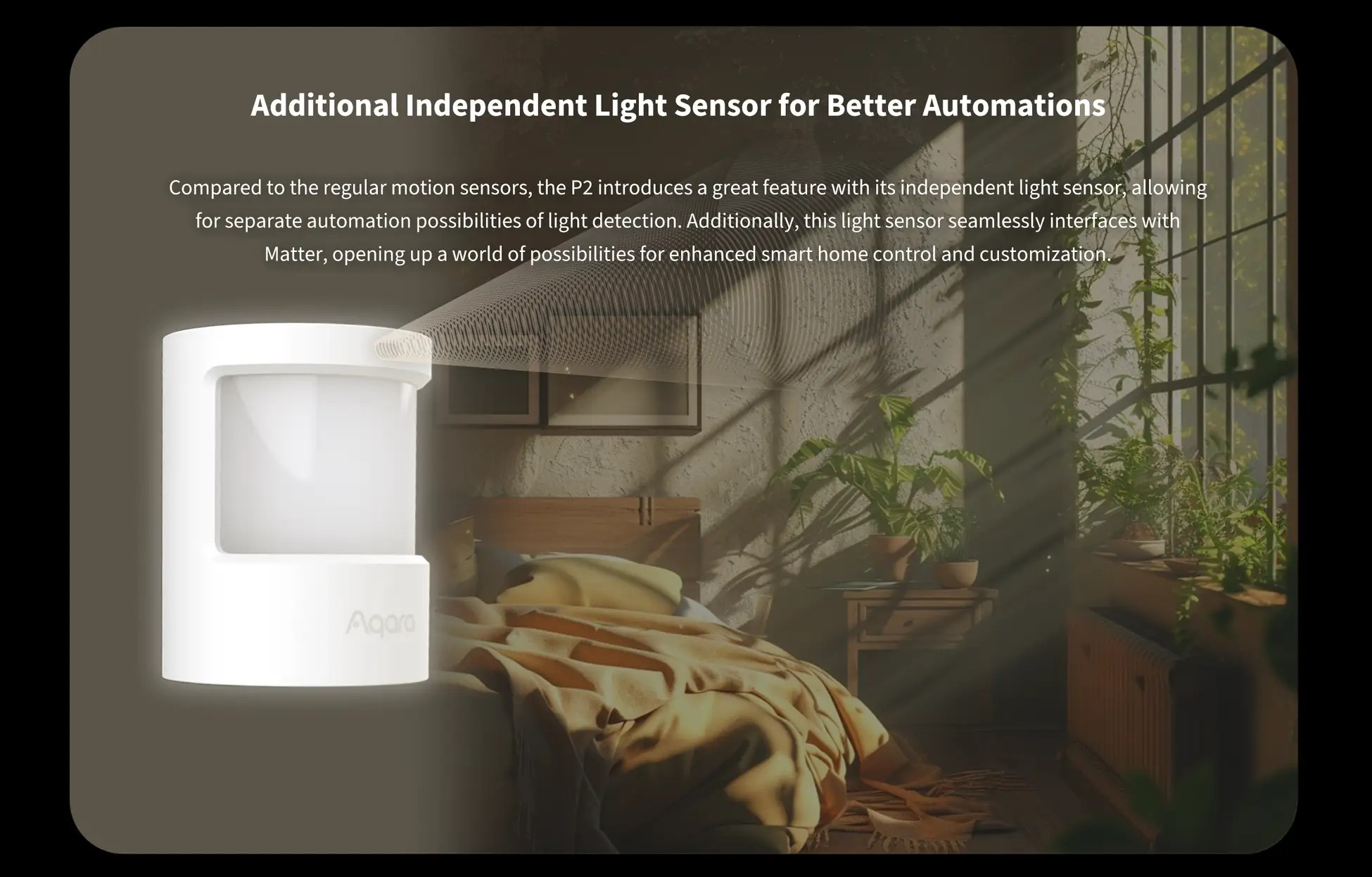 ⼀般の⼈感センサーと⽐較して、⼈感センサーP2には独⽴した光センサーが組み込まれています。Matterにも対応した光センサーはモーションセンサーと独⽴して、様々な⾃動化シーンで利⽤できます。これにより、照度が200ルクス以下になった場合のみ照明をつけるなど、カーテンや照明の⾃動化をより柔軟に設定できます。
