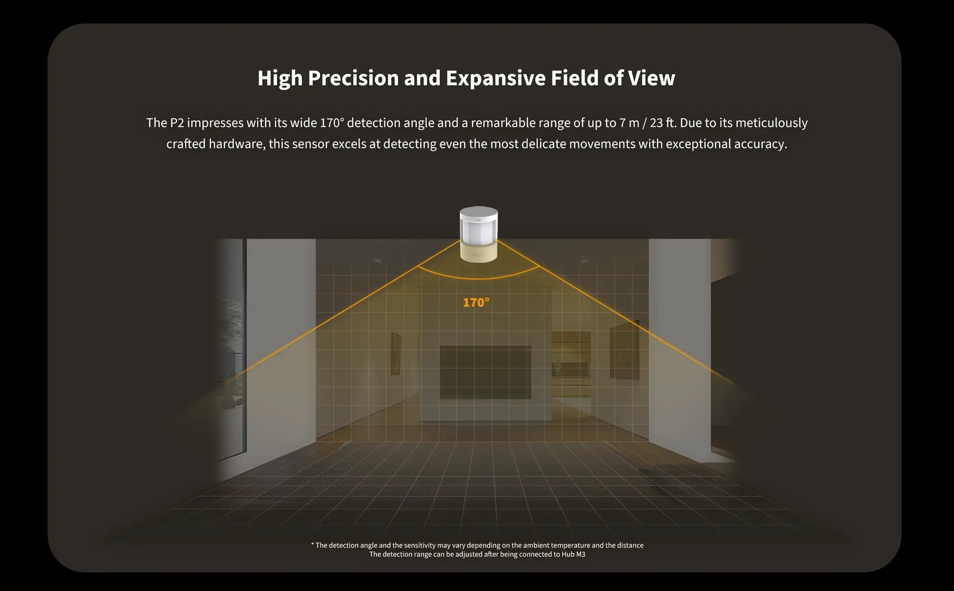 ⼈感センサーP2は、⽔平⽅向に最⼤170°、垂直⽅向に45°の広い検知⾓を持ち、最⼤7メートル(発売予定のM3ハブと組み合わせて使⽤する場合、10メートルまで延⻑可能)の検知範囲をカバーできます。さらに、精密なハードウェアのおかげで、⼈感センサーP2は微細な動きさえも検出できます。