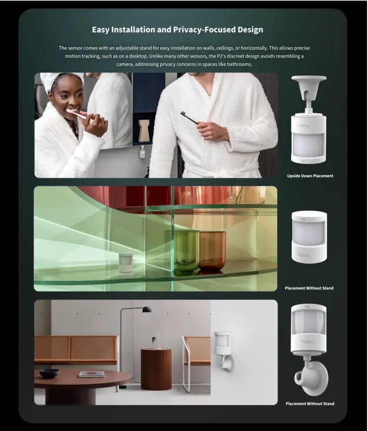 ⼈感センサーP2には360度調整可能なスタンドが付属でついており、壁、天井、または⽔平に簡単に取り付けられ、特定エリアだけを検知するように⾓度を簡単に調整することもできます。また、⼈感センサーP2はカメラのような⾒た⽬で利⽤者に負担をかけることを避けるようにデザインされ、浴室などのプライベートな場所でも安⼼して使えます。