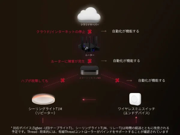 *現時点、⼀部のAqara Zigbeeデバイス(シーリングライトT1M、LEDテープライトT1)がこの機能に対応しており、M3ハブの故障時でも⾃動化を実⾏できます。