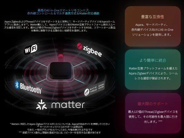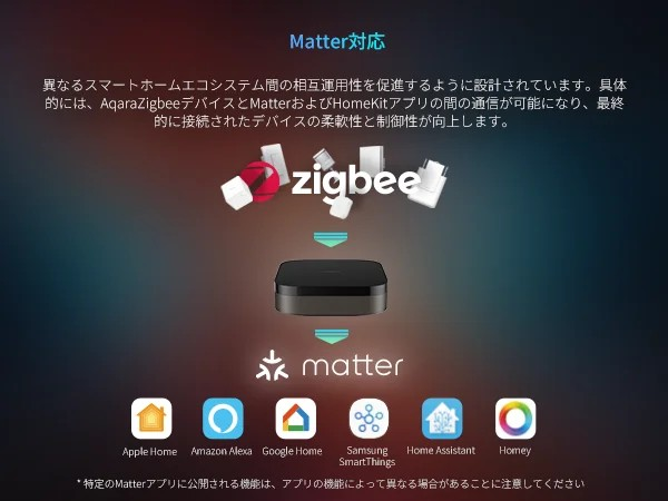 従来のAqaraハブ製品と同様に、M3ハブはAqaraのzigbeeデバイスを管理したり、Matterブリッジ機能でMatter⾮対応zigbeeデバイスをMatterに対応させたりすることができます。その他、Aqara最新のThreadデバイスをM3ハブに登録し、従来のzigbeeデバイスと連携させることも可能になります。