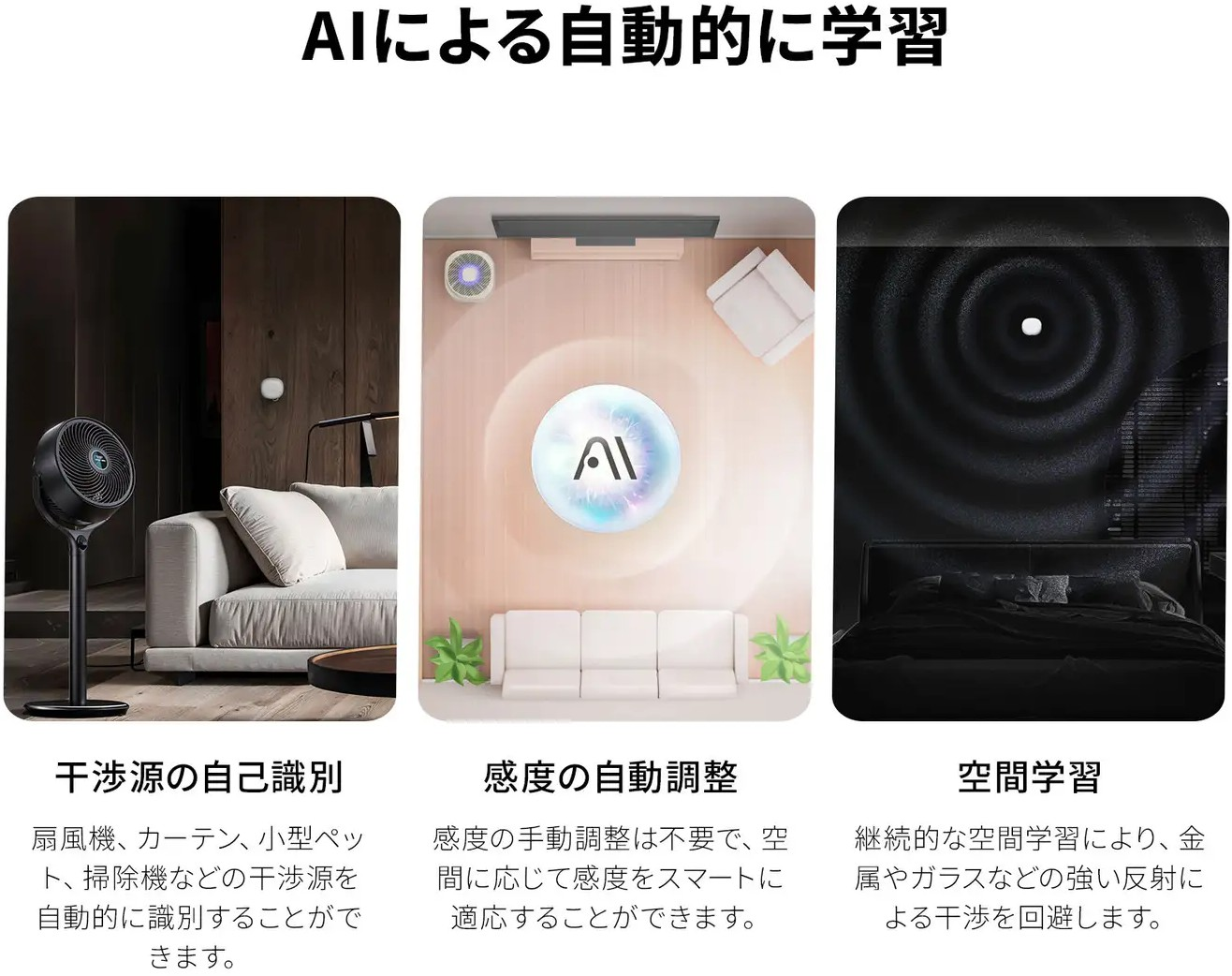 強⼒なAI学習能⼒の搭載により、⼈感センサーFP1Eは強い反射物、⼀般の電気機械、⼩動物などの⼲渉源を識別、排除できるほか、検出感度を⾃動で調整し誤検知を防げます。また、継続的に環境学習を続けるため、⼈感センサーFP1Eは使えば使うほど性能が⾼まり、検知精度を向上することができます。