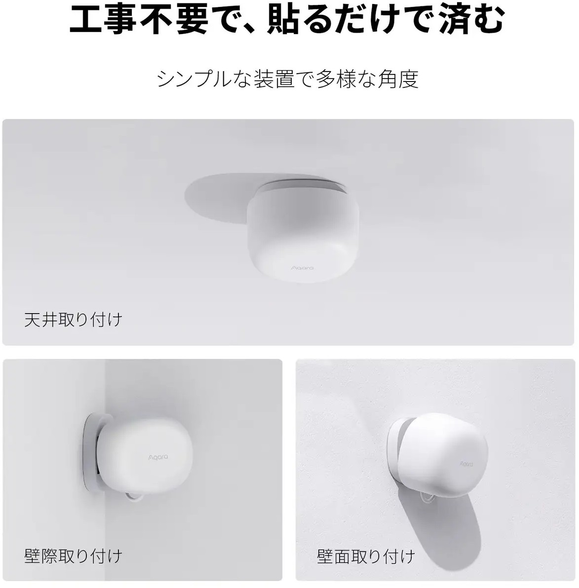 ⼈感センサーFP1Eは、磁⽯と接着剤付きのブラケットが付属でついているため、壁や天井、コーナーに簡単に取り付けられます。