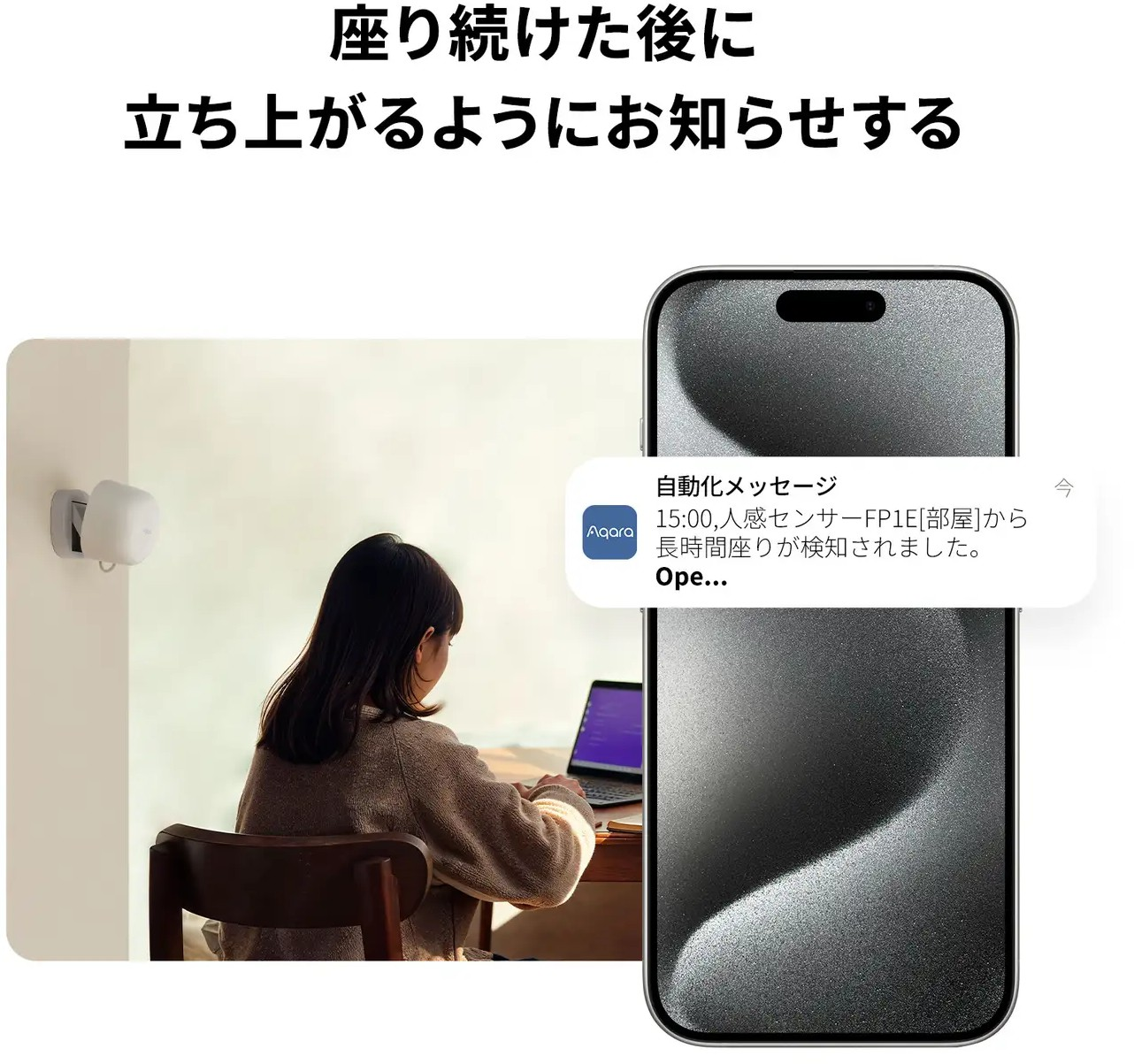 ⼈感センサーFP1Eは、⼈が動いているか動いていないかを正確に検出し、その状態の継続時間も把握できます。これにより、⼈の状態に応じてより幅広い⾃動化が実現できます。例えば、⻑時間座ったままで動かない状態を検出したら、休憩を促すリマインドを送ったり、ライトを点滅させたりすることができます。
