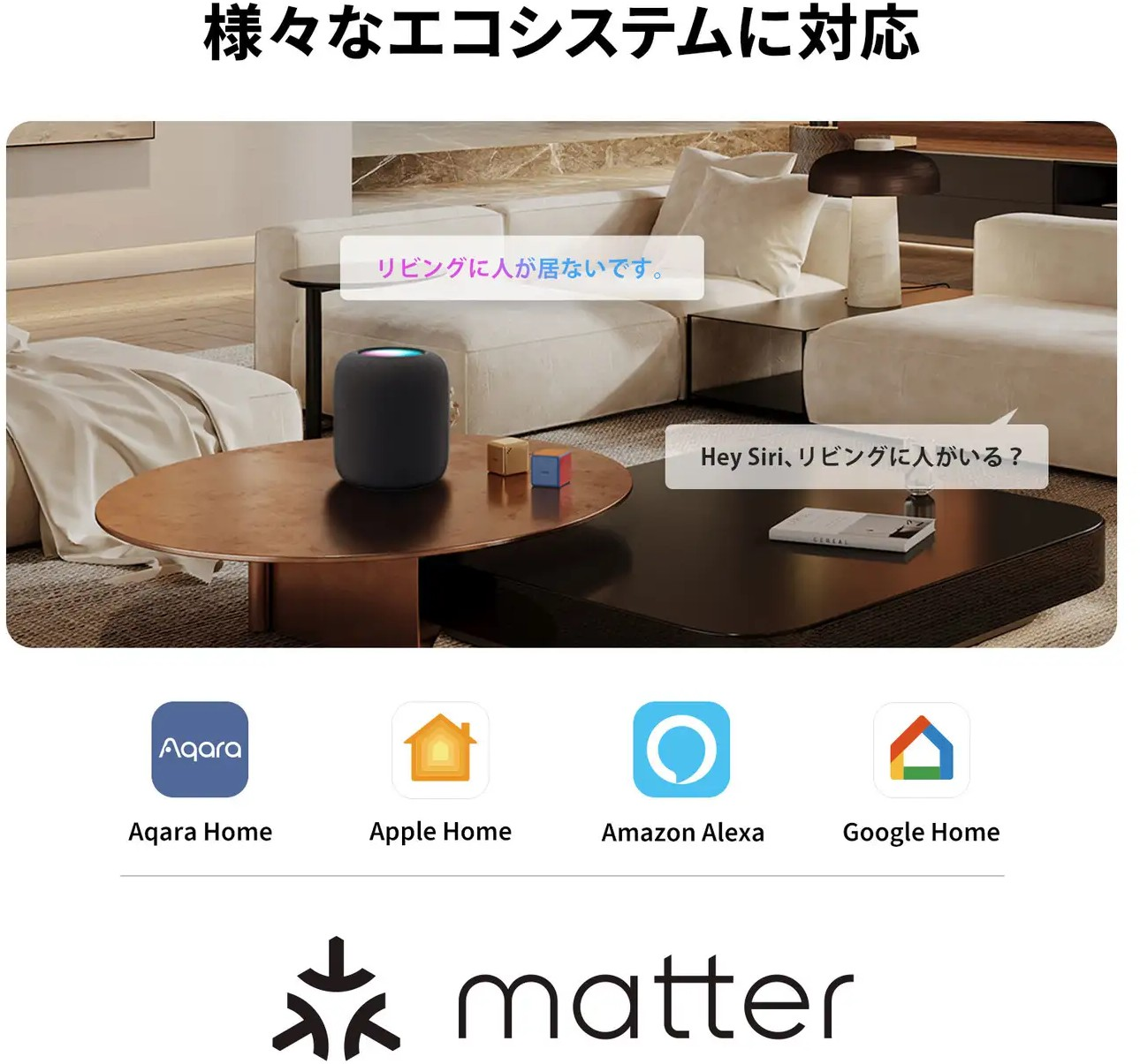 ⼈感センサーFP1Eは、AqaraのZigbeeハブ(M2ハブとスマートカメラG3ハブ)を経由してMatterに対応可能、Apple Home、A mazon Alexa、Google Home、Samsung SmartThings、Home Assistantなどの主要エコシステムとシームレスに統合できます。