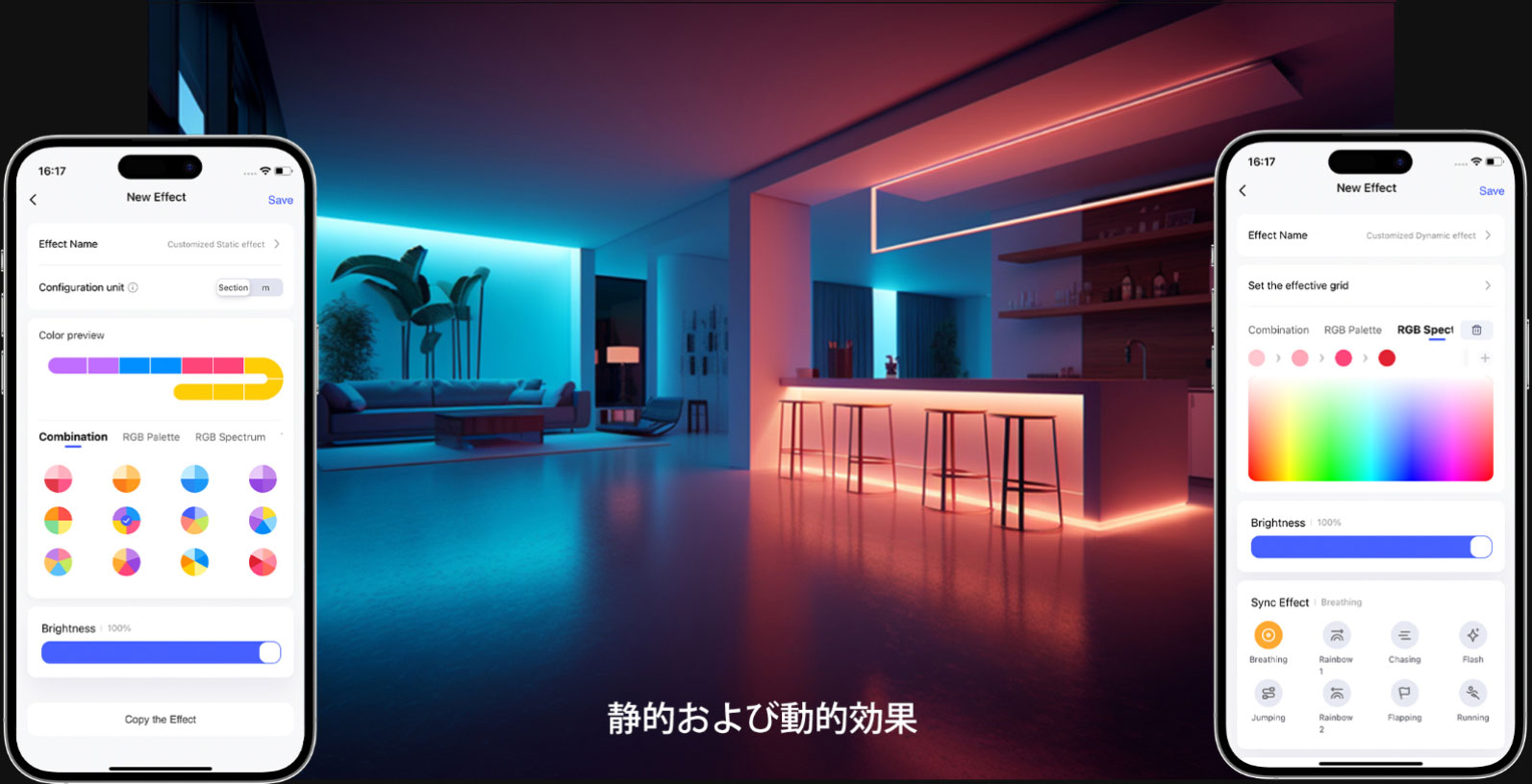 テープライトはセクションごとに個別に設定できます。異なる色、明るさ、および効果をサポートしています。