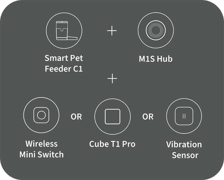 Use Aqara sensors or wireless controllers to train your pet! For example, teach your dog to press the Mini Switch, move the Cube T1 Pro or touch the bowl with the Vibration Sensor attached, and the Feeder will dispense the food to reward your pet.