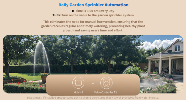 IF Time is 6:00 am Every Day. THEN Turn on the valve to the garden sprinkler system. This eliminates the need for manual intervention, ensuring that the garden receives regular and timely watering, promoting healthy plant growth and saving users time and effort.