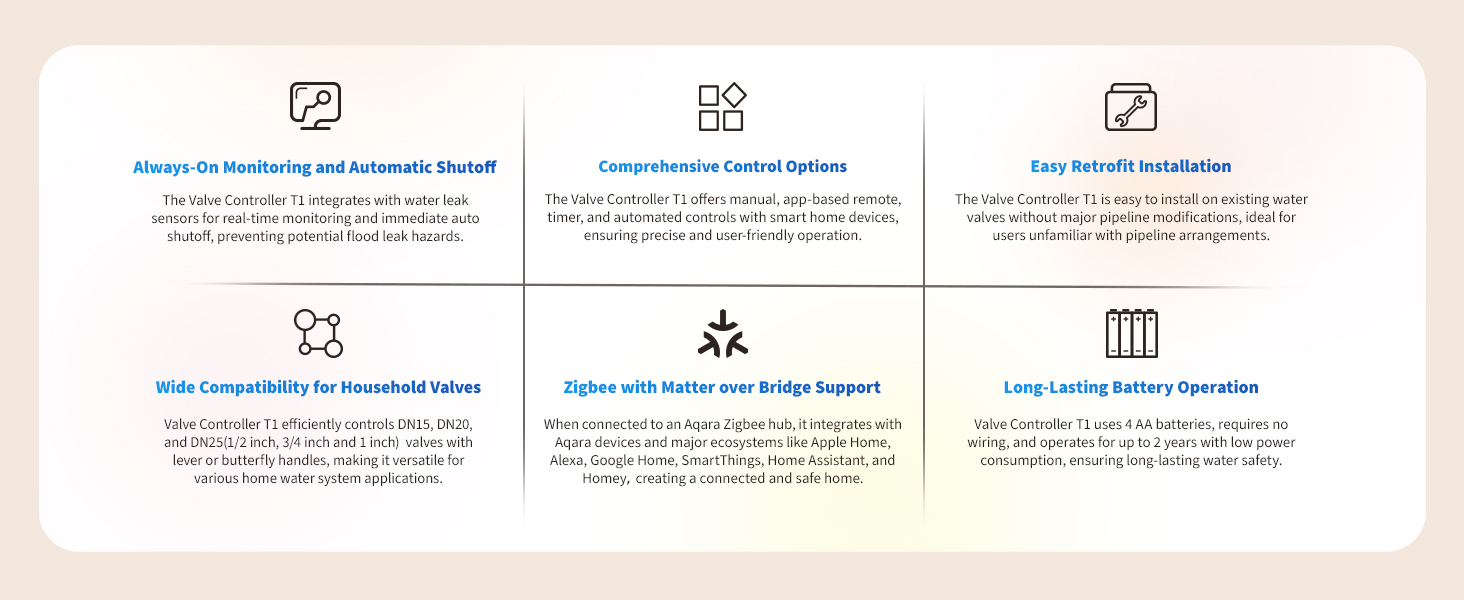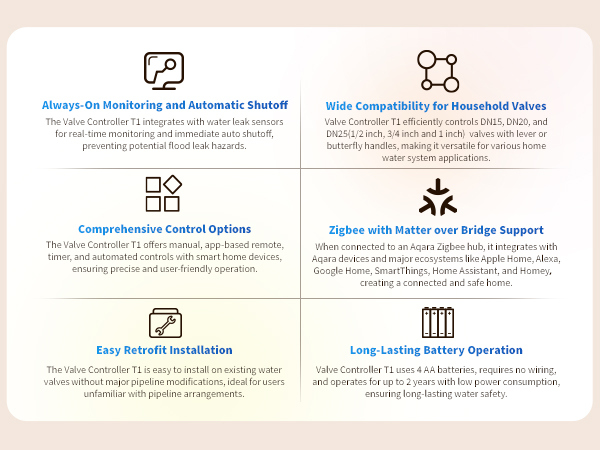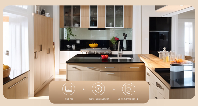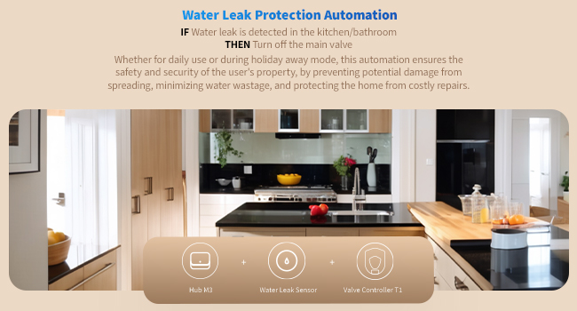 IF Water leak is detected in the kitchen/bathroom. THEN Turn off the main valve. Whether for daily use or during holiday away mode, this automation ensures the safety and security of the user's property, by preventing potential damage from spreading, minimizing water wastage, and protecting the home from costly repairs.